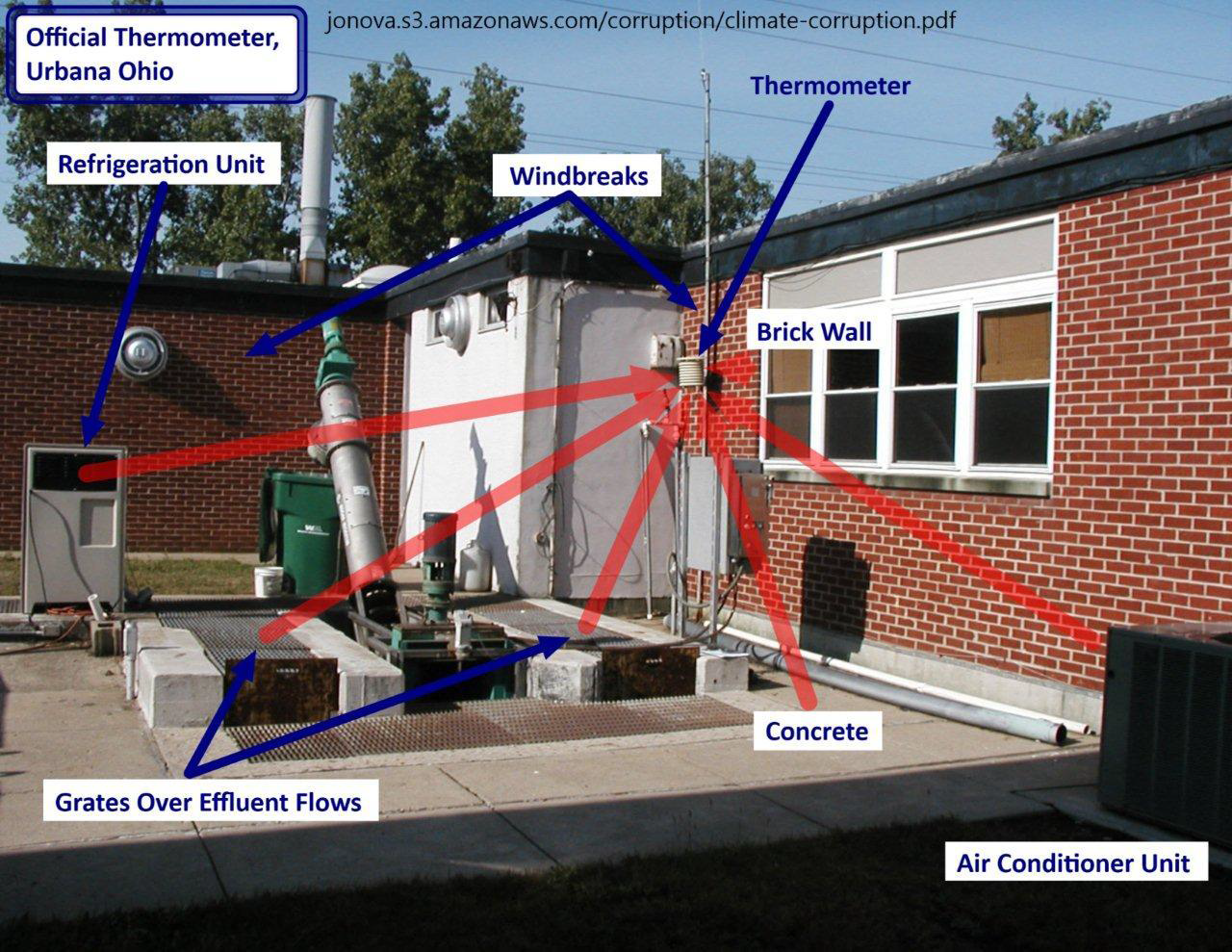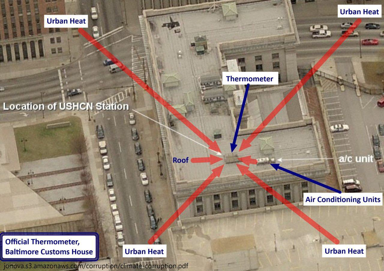 . . . One “cause” of rising average global temperatures is the urban heat island effect. Cities are hotter than rural areas. Many of the reporting stations that were once in undeveloped rural areas have experienced either suburban or urban development, or the stations have been moved to more urban settings. It is well documented that some have been, seemingly intentionally, relocated near or at heat sources such as paved parking lots and air conditioners.