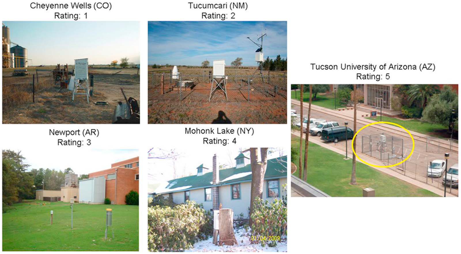 Figure 3. U.S. Historical Climate Network (USHCN) station exposure at sites representative of each CRN class: CRN 1, a clear flat surface with sensors located at least 100 m from artificial heating and vegetation ground cover <10 cm high; CRN 2, same as CRN 1 with surrounding vegetation <25 cm and artificial heating sources within 30 m; CRN 3, same as CRN 2, except no artificial heating sources within 10 m; CRN 4, artificial heating sources <10 m; and CRN 5, sensor located next to/above an artificial heating source.